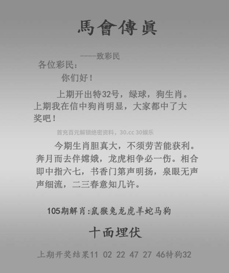 108期马会传真: 今期开奖猪牛兔,三六一四财运到 圆圆滚滚白馒头,道人送你绿波彩 零九一零多考虑,中间生肖要发财 双数开彩大家买,真真假假假亦真 水来土掩 解:今期道人送你绿波彩,解绿波,双数开彩大家买,解双数特码生肖虎鼠狗猴马龙 综合:鼠蛇兔狗牛鸡马猪猴 |